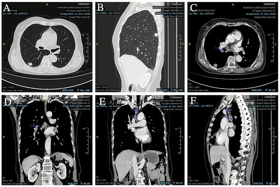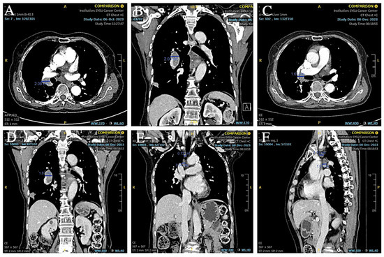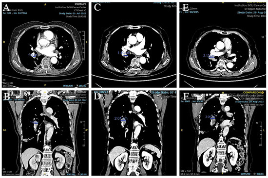 Based on the patient’s medical history and the results of the puncture biopsy examination, we diagnosed this patient with hilar lymph node metastasis from SCLC combined with a rare EML4-ALK fusion gene mutation. Due to the patient’s refusal to undergo chemotherapy, ensartinib was chosen as the first-line agent for targeted therapy. The patient was given 225 mg of ensartinib (Ensacove) orally once a day for two weeks, and after two weeks of treatment, a repeat CT showed that multiple lymph nodes in the mediastinal region had partially shrunk compared to before. Since the patient developed symptoms of drug rash (CTCAE grade 4) within two weeks of the first dose, we adjusted the dose to 200 mg daily and continued treatment for two weeks. A repeat CT two weeks later (34 months postoperatively) suggested that multiple lymph nodes in the mediastinal region continued to shrink from the imaging two weeks earlier (Figure 9A,B). As this patient showed a trend toward improvement on imaging after a month-long course of ensartinib, we elected to continue treatment at ensartinib 200 mg daily for this patient. As of 8 December 2023 (36 months postoperative), the patient’s hilar lymph node had shrunk to a smaller short diameter of 19 mm (Figure 9C–F). The patient still received ensartinib and the cutoff time for documenting the condition in this case report was 31 January 2025 (49 months postoperative). The patient achieved a PFS of more than 12 months with ensartinib.
