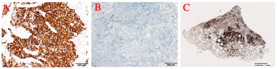 SCLC originates from neuroendocrine cells in the central airways, whereas LAdC originates from alveolar type II cells located on the alveolar surface [17]. Alveolar type II cells may be a common precursor of LAdC and SCLC [18,19,20,21]. Non-small cell lung cancer undergoes neuroendocrine transformation in the absence of TKI targets or other therapeutic approaches, as also demonstrated in previous studies [22]. The EGFR/TP53/RB1 triple mutation may increase the risk of SCLC transformation. However, SCLC transformation can also occur in ALK-positive patients [23]. In this case, the histologic component of non-small cells was not detected from the very first surgical specimen, and the patient could be discharged as a transformation of non-small cell lung cancer.