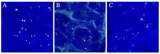 Figure 4. (A) The FISH result of ALK gene breakage test was negative. (B) The FISH result of ROS1 gene breakage test was negative. (C) The FISH result for C-MET gene amplification was negative.