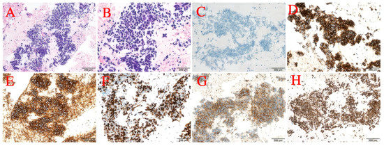 From the end of the surgery to 2021-12-27 (12 months postoperatively), no abnormalities were found in the review imaging and no prophylactic treatment was performed. On 20 June 2022 (18 months postoperatively) when the CT was reviewed again, it was found that the right hilar lymph node was significantly enlarged compared to the previous one, with the short diameter increasing to about 14mm and with obvious enhancement, but still no corresponding treatment was performed (Figure 7A,B). During the period July 2022 to June 2023 (12 months), the patient’s CT results suggested that the lymph nodes were stable, and did not progress again until September 2023, and the patient refused treatment during this period. On 4 September 2023 (33 months after the operation), the CT examination was repeated and found that the multiple enlarged lymph nodes in both hilar regions had partially fused with each other, and the short diameter had increased to about 21 mm, with unclear boundaries and uneven enhancement, which was considered to have a high possibility of metastasis (Figure 7C–F). The patient was suspected of having recurrent metastases in the right hilar lymph nodes, so the patient received an ultrasonic bronchoscopic puncture biopsy (EBUS-TBNA), and the results of the biopsy showed that heterogeneous cells were seen in the right hilar lymph node fluid matrix and cell block sections, and the morphology was consistent with malignant tumor cells, which were suspected to be small cell carcinoma cells. Immunohistochemical results: ALK(D5F3) (+); ALK-N (−); CK(AE1/AE3) (+); TTF-1 (+); CD56 (+); Syn (+); CgA (+); and Ki-67 (about 80%+) (Figure 8). Immunohistochemistry results still showed no non-small cell histologic binding. Combined with the history and immunohistochemical results, this was consistent with small cell carcinoma relapse.