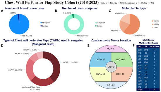 Among the 197 surgeries for breast cancer, 150 underwent partial breast reconstruction using a single flap based on a single perforator, and 50 had it using combined flaps. All the six benign surgeries used a single flap based on a single perforator. Figure 2D represents the various types of chest wall perforators utilized as single or dual for the breast cancer patients. The subtype distribution for breast cancer patients in the cohort is represented in Figure 2C and Table 2. Figure 2E,F represent quadrant-wise tumor location in unifocal and multifocal/multicentric cases.