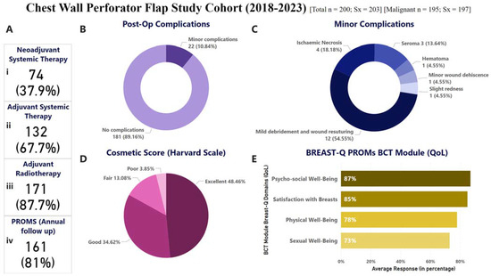 This figure presents outcomes and follow-up data from the chest wall perforator flap study cohort (2018–2023). (A) Neo and adjuvant therapy and follow-up statistics: (Ai) Neoadjuvant systemic therapy. (Aii) Adjuvant systemic therapy. (Aiii) Adjuvant radiotherapy. (Aiv) PROMs (Patient-Reported Outcome Measures). (B) Postoperative complications overview. (C) breakdown of minor complications. (D) Patient-Reported Outcome Measure (PROM) Scores. (E) Cosmetic outcomes (Harvard scale).