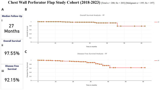 In the current cohort of 200 cases undergoing PF surgeries, 22 cases (11%) developed post-operative complications, classified as per Clavien–Dindo Classification adapted for breast cancer [25]. A low rate of Grade I/II complications was observed immediately post-surgery, with all complications treated in outpatient settings. Figure 3B,C depict the post-operative complications observed in the current study.