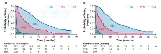 The primary endpoint was PFS as assessed by blinded independent central review, per Response Evaluation Criteria in Solid Tumors v1.1. Secondary endpoints included OS, objective response rate, clinical benefit rate, duration of response, safety, and patient-reported outcomes. PFS was defined as the time from randomization to first observation of tumor progression or death due to any cause, whichever came first, or patient censoring at the last radiographic assessment. OS was defined as time from randomization until death due to any cause, or patient censoring at their last documented visit [8]. Treatment-emergent adverse events (TEAEs) were defined as any AEs that occurred or worsened from the start of study drug treatment through 30 days after the last dose of the study drug. TEAE severity was graded using the National Cancer Institute Common Terminology Criteria for Adverse Events v5.0. The Q-TWiST analysis was performed in the intention-to-treat (ITT) population (all randomly assigned patients).
