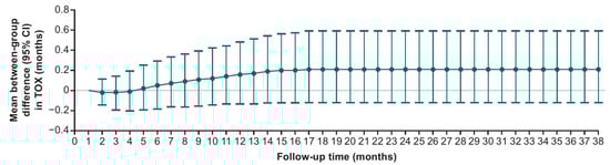 Mean between-group difference in time spent in TOX over time for SG vs. TPC.