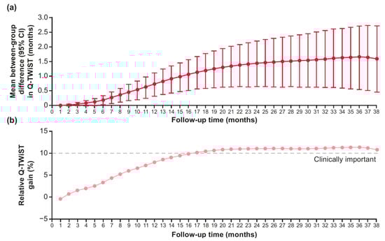 When Q-TWiST was analyzed at different follow-up times, the between-group difference in Q-TWiST favored SG over TPC, and this difference increased over time up to month 36 (Figure 3a). The relative Q-TWiST gain also increased over time and passed the threshold for clinical meaningfulness at month 17 (Figure 3b).