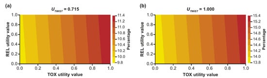 Relative Q-TWiST gains were primarily driven by UTOX, i.e., for a given value of UREL, relative Q-TWiST gain varied substantially based on UTOX, while for a given value of UTOX, relative Q-TWiST gains did not vary substantially by UREL values. With UTWiST set to 0.715, relative Q-TWiST gain exceeded the 10% threshold for clinical importance for all UTOX values >0.07, and relative Q-TWiST gains varied from 9.9% to 11.4% (Figure 4a). With UTWiST set to 1.000, relative Q-TWiST gain exceeded the 10% threshold for all UTOX and UREL values, with relative Q-TWiST gains ranging from 13.9% to 15.3% (Figure 4b). All relative Q-TWiST gains in this sensitivity analysis were statistically significant across UTOX and UREL ranges for both UTWiST = 0.715 and UTWiST = 1.000.
