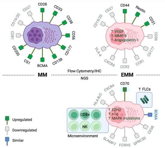 Immunophenotype of MM (Left) and EMM (Right). Top: Flow cytometry and immunohistochemistry analyses reveal significant differences in the expression of chemotactic and adhesion receptors between EMM and MM. Bottom: Next-generation sequencing studies show increased expression of free light-chains and CD70 in EMM cells and decreased expression of therapeutic targets such as CD38, SLAMF7, GPRC5D, and FCRH5. There was also enrichment of CD8+ T cells and NK cells within the EMM microenvironment. (Created using Biorender).