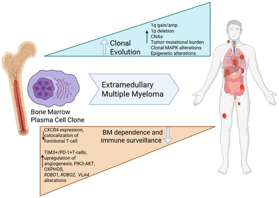 Current evidence supports the notion that extramedullary spread occurs after multiple myeloma (MM) has homed to the BM and eventually loses BM dependency and anchorage, allowing EMM to egress, survive, and proliferate outside the BM [67,68].