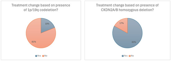 When presented with specific molecular findings, respondents’ management strategies varied. In the event that the primary tumour pathology revealed a 1p/19q codeletion confirming a diagnosis of grade 2 oligodendroglioma, 19% of clinicians indicated they would change their management approach. Of these (n = 8), 5 recommended adjuvant chemotherapy in the presence of a 1p/19q codeletion [