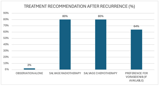 Upon disease recurrence in our scenario 1 patient after 24 months of observation and further surgical resection, 80% of the 42 clinicians who responded preferred adjuvant combination therapy with chemotherapy and radiotherapy in the absence of vorasidenib availability [