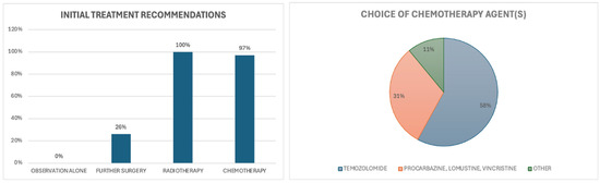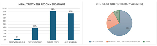 Figure 7]. Of 39 clinicians who responded to this question, only one suggested observation alone. Over one-third (38%) recommended salvage surgery if feasible, and the majority (83%) recommended a combination of adjuvant chemotherapy and radiotherapy. Among those who specified a chemotherapy regimen (n = 25), temozolomide was the preferred agent, selected by 64% of respondents [