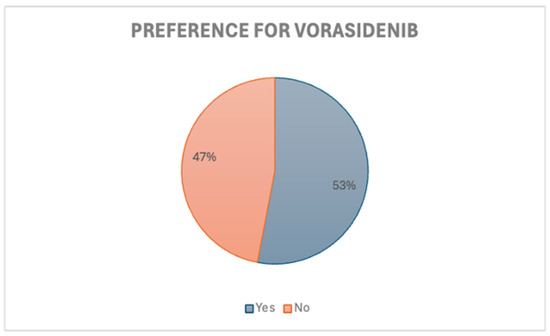 Figure 4]. When evaluating responses by sub-specialty, 62% of medical oncologists and 83% of radiation oncologists did not prefer vorasidenib. Those who favoured standard therapy options attributed this to a lack of supporting data for vorasidenib use in patients without residual disease, along with a preference to reserve vorasidenib for use upon recurrence.