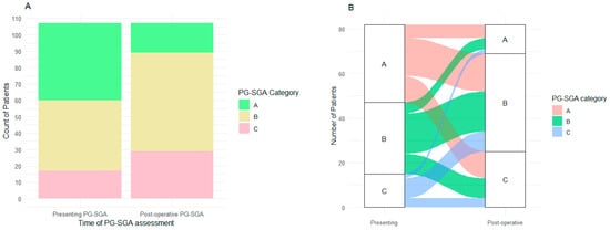Figure 1. (A) The patient-generated subjective global assessment (PG-SGA) status of patients (n = 107) at presentation and post-operatively. More patients had poorer nutritional status post-operatively (p < 0.001). (B) Paired presenting and post-operative PG-SGA of patients (n = 82). The figure demonstrates the transition of patients between the PG-SGA groups, with more patients becoming more malnourished post-operatively overall.