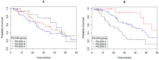 While the nutritional status as measured by PG-SGA at presentation was not associated with OS (p = 0.4, Figure 2A), the post-operative nutritional status of patients was significantly associated with OS (p < 0.001, Figure 2B). Compared to PG-SGA A, patients with post-operative PG-SGA C had a significantly poorer OS (HR: 5.67; 95%CI: 1.91–16.86; p = 0.002), while there was a non-significant trend for patients in the PG-SGA B group (HR: 2.42; 95%CI: 0.84–7.00, p = 0.10). Nutritional status by PG-SGA assessment was not significantly associated with DFS at either presentation (p = 0.051) or post-operative time points (p = 0.24).