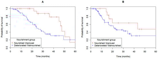 Figure 3. Gastric, gastroesophageal junction and esophageal adenocarcinoma patients who maintained a well-nourished state or improved their severity of malnutrition according to patient-generated subjective global assessment (PG-SGA) category (PG-SGA C to PG-SGA B or A, or PG-SGA B to A), had improved both (A) overall survival (HR: 2.71; 95%CI: 1.24–5.95, p = 0.007) and (B) disease-free survival (HR: 2.68; 95%CI: 1.17–6.14, p = 0.01).