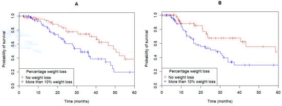 More than half of the patients (n = 65, 54%) lost more than 10% of their presenting body weight between presentation and the post-operative period. Loss of greater than 10% of presenting body weight was significantly associated with a poorer OS (median OS 32 months vs. 50.4 months; HR: 2.07; 95%CI: 1.15–3.72; p = 0.01; Figure 4A) and DFS (median DFS: 27.9 vs. 58.5 months; HR: 2.2; 95%CI: 1.19–4.08; p = 0.009; Figure 4B).