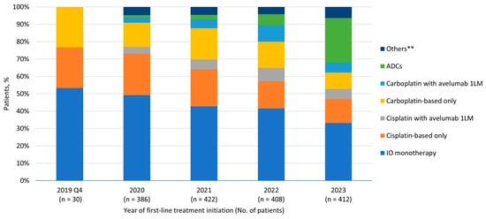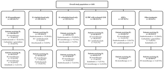 | Characteristics | Overall * (n = 1658) | IO Monotherapy (n = 683) | Cisplatin-Based Only (n = 305) | Carboplatin-Based Only (n = 233) | Cisplatin with Avelumab 1LM (n = 93) | Carboplatin with Avelumab 1LM (n = 93) | ADCs (n = 147) | Others ** (n = 80) |