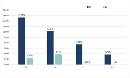 As shown in Table 2, the overall incidence of CIM was 86.4%, predominantly grade I (25.9%) and grade II (40.7%), with a lower incidence of grade III or higher events (19.8%). The incidence of chemotherapy-induced neutropenia (CIN) was 59.3%, primarily grade II (27.2%). The incidence of chemotherapy-induced thrombocytopenia (CIT) was 50.6%, with grade I (27.2%) being the most common. Chemotherapy-induced anemia (CRA) had the highest incidence (69.1%), dominated by grade I events (46.9%). Figure 1 indicates that grade III events occurred more frequently than grade IV across all types of hematological toxicity (CIM: grade III 17.3% vs. grade IV 2.5%; CIN: grade III 12.3% vs. grade IV 3.7%; CIT: grade III 7.4% vs. grade IV 0%; CRA: grade III 3.7% vs. grade IV 0%).