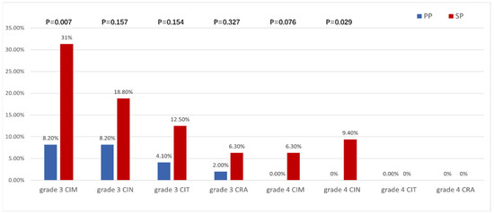 Table 3 compares the incidence and severity of myelosuppression between the PP and SP groups. The incidence of CIM was significantly higher in the SP group than in the PP group (96.9% vs. 79.6%), with higher rates of grade III/IV events (31.3% vs. 8.2%; 6.3% vs. 0%, respectively). Similarly, the overall incidence of CIN was higher in the SP group compared to the PP group (71.9% vs. 51.0%), with significantly more grade III/IV events in the SP group (18.8% vs. 8.2%; 9.4% vs. 0%). For CIT, the total incidence was also higher in the SP group (65.6% vs. 40.8%), particularly for grade II and III events (31.3% and 12.5% in the SP group vs. 6.1% and 4.1% in the PP group). CRA was more common in the SP group (81.3% vs. 61.2%), with a higher incidence of grade III events (6.3% vs. 2.0%). These results demonstrate that the PP group had significantly lower rates and severity of CIM, CIN, CIT, and CRA compared to the SP group. Figure 2 highlights the differences in the incidence of grade III/IV myelosuppression between the two groups, with the SP group showing higher severity across all types.
