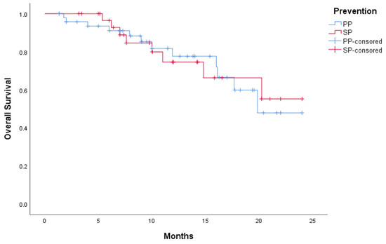 As shown in Table 5, in the PP group, 22 patients exhibited a complete response (CR), 23 a partial response (PR), 2 stable disease (SD), and 2 progressive disease (PD). In the SP group, 13 patients achieved CR, 14 PR, 3 SD, and 2 PD. The overall response rates (ORR) were similar between the PP and SP groups (91.8% vs. 84.4%), as were disease control rates (DCR: 95.9% vs. 93.8%), with no statistically significant differences. The 1-year overall survival (OS) rates were also comparable (PP: 83.7% vs. SP: 81.3%, p > 0.05; Figure 4).