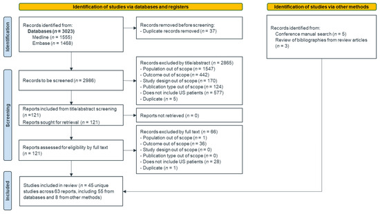 The search and screening results are illustrated in the PRISMA flow diagram in Figure 1. A total of 3023 publications were identified through database searches. After de-duplication, 2986 unique records were retained for title and abstract review. A total of 121 records were retained for full-text review, and 8 additional records meeting the eligibility criteria were identified from manual searches of conferences and bibliographies of review articles. After full-text review, 63 eligible publications reporting data on 45 unique studies were included for data extraction.