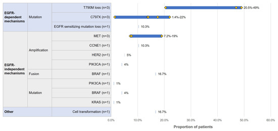 In addition, several other EGFR-dependent mechanisms of resistance, including EGFR amplification, mutations in L718Q/V, and G724S, were reported in varying proportions for patients who received first- or second-line osimertinib. Several studies also reported the proportion of patients with EGFR exon 19 deletion, L858R, driver single-nucleotide variant, and exon 20 insertion as part of the mutation profile at progression, without clearly distinguishing EGFR activation mutations and resistance mutations in the report [19,30,53]. Considering that these are typically recognized as EGFR activation mutations, they were not captured as resistance mechanisms.