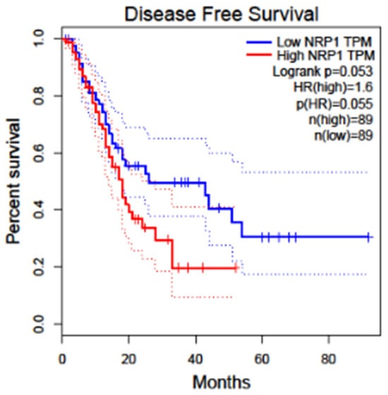 NRP1 is expressed in tumor-associated vessels and various cancers, indicating a role in tumor progression. A recent study shows that NRP1 expression has been identified in the blood vessels in more than 98% of cancer cases. In contrast, its expression in cancer varies depending on the tissue origin, histological sub-type, and stage []. NRP1 overexpression correlates with tumor aggressiveness, advanced disease stage, and poor prognosis [,]. The overall survival of patients in SKCM (Skin Cutaneous Melanoma) with high and low NRP1 groups shows no difference. Figure 7 shows the overall survival and disease-free survival analysis for KIRC patients with respect to NRP1. Increased level of NRP1 is associated with tumor invasiveness and metastatic potential [], for instance, in melanoma and breast cancer [,]. NRP1 is also implicated in mediating the effects of VEGF-A and semaphorins on cancer cells’ proliferation, survival, and migration []. The expression of NRP1 has also been reported by several stromal cells, including fibroblasts and endothelial and immune cells, which can be stimulated by non-VEGF family growth factors and influence tumor progression [,]. Many human metastatic lesions derived from melanoma cell lines secrete VEGFA and express its receptors, including NRP1 []. NRP1 enhances the activation of a VEGFA/VEGFR2 autocrine loop, which leads to melanoma cell invasion into the ECM [] through the up-regulation of VEGF-A and metalloproteinases secretion []. Moreover, NRP1 over-expression provides human melanoma cells with an increased in vivo growth rate [].