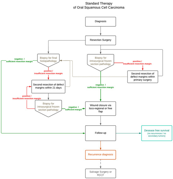 OSCC patient’s therapeutic regime of included patients was in accordance with the usual therapeutic approach at the Department of Craniomaxillofacial and Facial Plastic Surgery, University Medical Center Frankfurt, Germany, and according to the corresponding guidelines for OSCC indications (see Figure 1). Therapy planning was further based on the individual patient’s clinical history and consultation by the tumor board expert panel. In summary, the usual approach after histopathological confirmation of OSCC was surgical resection of the tumor including sufficient safety margin to reach R0 status. If intraoperatively obtained biopsies analyzed as frozen sections or post-surgical histopathological evaluation of all taken biopsies revealed residual OSCC within samples, a second tumor resection of the compromised area was performed. The same approach was chosen if the resection margin had not yet reached R0. Depending on the histopathological outcome and consent achieved by the tumor board expert panel, adjuvant therapy could be indicated post-surgery. Application of adjuvant therapy (radiotherapy, chemotherapy, or chemoradiotherapy) was done at the corresponding specialized departments at the University Medical Center, Frankfurt, Germany. All included patients were observed post-surgery in a defined follow-up regime at the Department of Craniomaxillofacial and Facial Plastic Surgery, including clinical and radiological evaluation of the healing progress and disease-free survival.