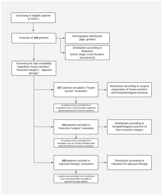 A total of 169 OSCC patients who met the inclusion criteria were included in this study (Figure 2). Data availability for analysis of demographic data, tumor distribution, recurrences, adjuvant therapy, and surgical endpoints, including frozen sections and resection margins, was assessed.