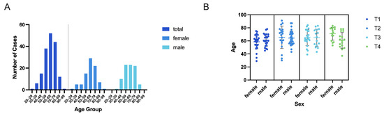 The descriptive statistics and statistical analysis were calculated using GraphPad Prism Analysis software (version 10.1.1, GraphPad Software, LLC., San Diego, CA, USA). Statistical analysis of nominal data was performed using the two-sided Fisher’s exact test at a confidence interval of 95%. Statistical analysis of age distributions according to sex and/or T-stage was performed using ordinary one-way ANOVA with a post hoc test for multiple comparisons (Tukey) at a confidence interval of 95%.