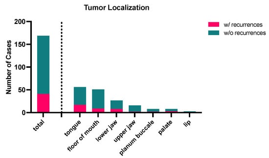 The overall ratio of patients with recurrences was 24.3% compared to 75.7% of patients without recurrence diagnosis. As expected, the highest number of cases with recurrences was found in the locations with the highest OSCC frequency, such as the tongue, floor of mouth, and lower jaw. Lower numbers were found for locations with a lower overall number of total cases within the analyzed patient cohort (see Figure 4). The ratio of cases w/recurrences showed the following distribution: 30.6% for tumors in the tongue (17 out of 56 cases), 17.6% for tumors in the floor of the mouth (9 out of 51 cases), 29.6% for tumors in the lower jaw (8 out of 27 cases), 12.5% for tumors in the upper jaw (2 out of 16 cases), 25% for tumors in the buccal mucosa (2 out of 8 cases), and 37.5% for tumors at the palate (3 out of 8 cases). No recurrence cases were observed in the three OSCC patients with tumors located on the lip.