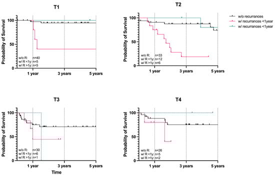 Patients with recurrences within the first year showed a significantly lower survival probability compared to those without recurrences. T-stage dependency was evident during the first year, but this dependency diminished in the following years (Figure 5, pink lines). T1 patients had a survival probability of 80.0% after 1 year, 40.0% after 3 years, and 40.0% after 5 years; T2 patients had 75.0% after 1 year and 18.75% after 3 years; T3 patients had 44.44% after 1 year and 44.44% after 2.5 years; and T4 patients had 80.0% after 1 year and 40.0% after 2 years.