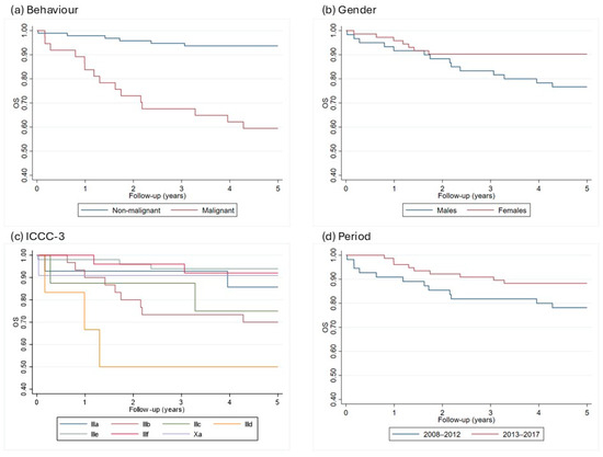 5-years Kaplan–Meier curves by behavior (a), gender (b), ICCC subgroups (c), and incidence period (d) in the Campania region, period 2008–2017. ICCC-3 = International Classification of Childhood Cancer, OS = overall survival.