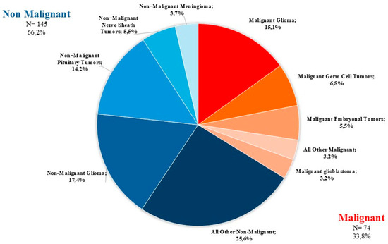 - The most common histology among non-malignant tumors was pituitary adenoma (20.7%), followed by pilocytic astrocytoma (16.6%).