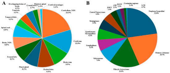 Distribution of primary brain and other CNS tumors (malignant and non-malignant combined), by (A) site and (B) histology (thirteen-year total = 219; annual average cases = 17) in the Campania region, period 2008–2020. CNS = central nervous system; NOS = not otherwise specified; CP = Craniopharyngeal; DNET = Dysembryoplastic Neuroepithelial Tumor; CPP = Choroid Plexus Carcinomas; PXA = Pleomorphic Xanthoastrocytoma; RGNT = Rosette-forming Glioneuronal Tumor; * Includes all histologies with frequency < 1%, including: craniopharyngioma (2), lymphoma (2), astroblastoma (1), anaplastic (1) and fibrillary (1) astrocytoma, Langerhans cell histiocytosis (1), malignant peripheral nerve sheath tumor (1), meningeal melanomatosis (1), oligodendroglioma (1), subepnedymal gian cell astrocitoma (1), diffuse intrinsic pontine glioma (1); ** Includes medulloblastoma (11), atypical teratoid-rabdoid tumor (1).