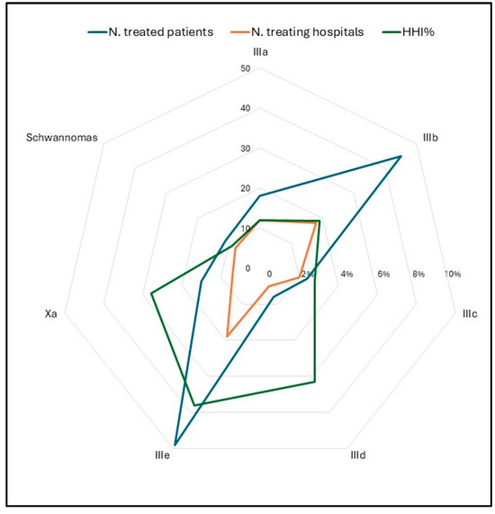 One hundred seventy-five adolescents (79.9%) were referred to a neurosurgical unit for diagnosis and/or neurosurgical treatment. The remaining patients (20.1%) were referred to other medical units (internal medicine, endocrinology, neurology). In 65.3% of cases, neurosurgery was managed by adult units. Fifty-seven adolescent patients (26%) were referred to specialized pediatric oncology units after their initial presentation. One hundred five (57.1%) patients underwent diagnosis and/or neurosurgical procedures in the Campania region. The remaining ninety-four (42.9%) migrated outside of the region. The distribution of hospitals where neurosurgical procedures were performed revealed a high degree of fragmentation. The HHI was 5.6% for malignant tumors and 4.2% for non-malignant tumors. The highest HHI% is observed for class IIIe, i.e., “Other specified CNS tumors”, primarily due to the fact that pituitary adenomas are predominantly treated in two specialized centers (Figure 6, Table 3).