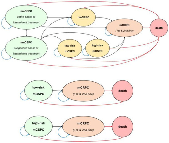 The following supporting information can be downloaded at: https://www.mdpi.com/article/10.3390/curroncol32040240/s1, Supplementary File S1, including Section S1: List of Treatment Sequences; Section S2: Time-in-suspended-treatment Parameters; Section S3: Parameter Estimation Algorithm; Section S4: Transition Probability Parameter Estimates; Section S5: Additional Figures and Tables; Supplementary CSV files S2: nmcspc_results, S3: low_risk_mcspc_results, and S4: high_risk_mcspc_results with main numerical results for patients starting in nmCSPC, low-risk mCSPC, and high-risk mCSPC, respectively. References [2,27,29,30,31,32,33,45] are cited in the Supplementary Materials.