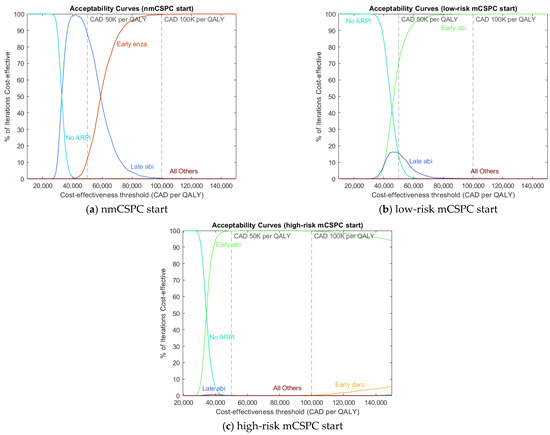 Acceptability curves for (a) patients starting in nmCSPC, (b) patients starting in low-risk mCSPC, and (c) patients starting in high-risk mCSPC.