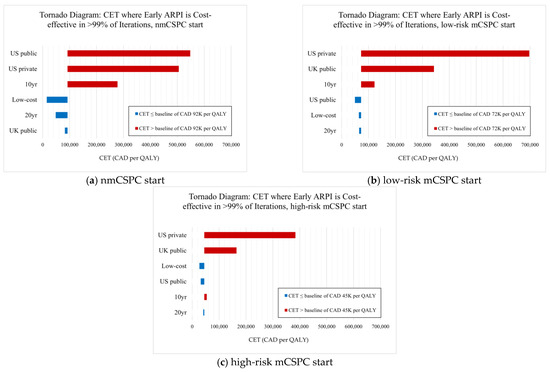 We present tornado diagrams for each starting state and sensitivity scenario below in Figure 3. First, we find the lowest CET at which early ARPI use is cost-effective for >99% of iterations in our base results, representing a CET baseline for supporting early ARPI use. There is a different base CET for each starting health state at which early ARPI use becomes cost-effective, such as CAD 92K per QALY for nmCSPC-starting patients. We then find the analogous CET for each sensitivity scenario, where a higher (red) CET means that early ARPI use is only cost-effective at higher funding levels, while a lower (blue) CET means that early ARPI use is cost-effective at even lower funding levels than in the base case.