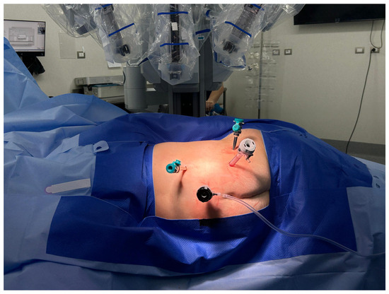 Under general anesthesia, patients were positioned in the lumbotomy position. The trocars were positioned as shown in the image (See Figure 1). The robot was then positioned above the patient’s shoulder, with the camera aligned with the kidney. All surgeries used the Da Vinci SI model.