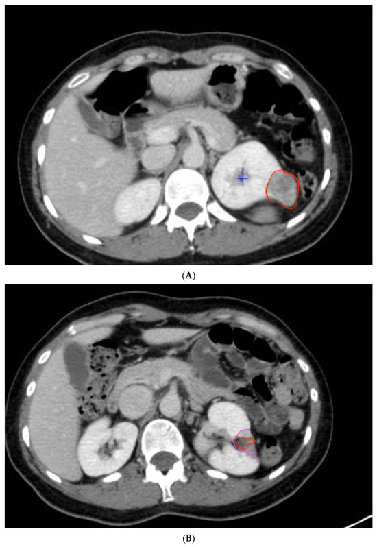 Kidney with exophytic tumor and control CT one year after surgery. (A) The first image shows a renal tumor on the posterior surface of the left kidney, measuring 3 cm, with characteristics of clear cell renal carcinoma (encircled in red). It is partially exophytic, located away from the renal hilum and the urinary collecting system. The blue cross marks the renal collecting system. (B) The second image shows the absence of the previously described mass. Post-operative changes are evident, with a scar in the area where the lesion was previously located and the morphological alterations of the kidney. Encircled in pink, the peritumoral necrotic halo is visible. In red, the bed where the tumor was located can be seen.