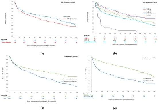 Table 4 presents the survival probabilities at year 1, 5, and 10, and mOS of the overall DDLPS cohort as well as stratifications by age, disease stage, advanced disease, resected status, and line of treatment received. For all 611 DDLPS patients, mOS was 69 (IQR = 15–151) months, with 1-year, 5-year, and 10-year survival rates of 76.6%, 52.4%, and 35.0%, respectively. Patients with retroperitoneal or abdominal tumours had significantly lower mOS when compared to those with other tumour sites (60 [14–151] vs. 101 [17–NA] months, p < 0.0001, Figure 1a). Stage I patients had the best survival outcomes, with a 1-year survival of 90.0% and an mOS of 85 [IQR:43–NA] months. Conversely, stage IV patients had the lowest survival rates, with a 1-year survival of 45.0% and an mOS of 8 months (see Figure 1b). DDLPS patients with advanced disease had lower 1-year (76.4 months, IQR = 71.1–81.7), 5-year (43.7 months, IQR = 36.8–50.6), and 10-year (21.9 months, IQR = 14.7–29.1) survival rates than those without advanced status, with an mOS of 53 (IQR = 15–108) months, while it was 103 [IQR = 16–NA] months for non-advanced patients (p < 0.0001, Figure 1c). Lastly, more patients with resected DDLPS were alive at 1 year when compared to unresected DDLPS, with a 1-year survival rate of 91.2% and an mOS of 131 [IQR = 57–NA] months compared to a 1-year survival of 67.3% and an mOS of 38 [IQR = 9–115] months (p < 0.0001, Figure 1d). The mOS values for those receiving 1L (N = 117) and 2L (N = 41) treatments were 16 [IQR:6–58] and 9 [IQR:5–16] months, respectively.