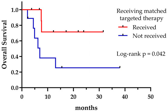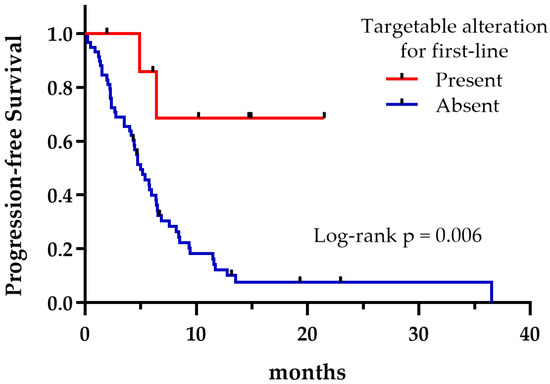 Regardless of the treatment received, the presence of potentially druggable alterations was not associated with a significant effect on OS, as shown in Figure 4 (p = 0.335). However, patients harboring druggable alterations that could reach a matched targeted therapy at any treatment line exhibited a longer median OS compared to those who could not (not reached vs. 6.9 months, p = 0.042) (Figure 5). Not surprisingly, patients with a targetable alteration for first-line treatment demonstrated a significantly longer PFS compared to those without a targetable alteration for first-line (not reached vs. 4.9 months, p = 0.006) (Figure 6).