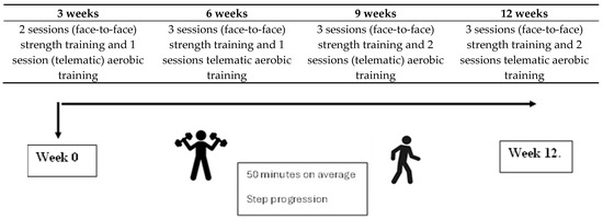 The treatment combined in-person exercise with telerehabilitation sessions, as outlined below. A progression was implemented in terms of the number of weekly sessions and in terms of the loads and types of training work. The first session comprised an initial interview, education, data collection and first contact between patient and physiotherapist. Subsequently, the first three weeks consisted of 2 in-person training sessions per week and 1 online session. The following three weeks consisted of 3 in-person training sessions and 1 online session. Finally, the remaining 6 weeks comprised 3 in-person sessions and 2 online sessions. A table illustrating the proposal is presented below.