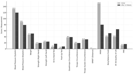 Blood pressure was reduced from 132/89 mmHg to 120/79 mmHg, representing a 9% decrease. Body weight increased from 47 kg to 50.6 kg, indicating a 7.6% gain. Muscular strength improved by 21.83% in the right hand and 22.44% in the left hand. The STST performance increased from 7 to 17 squats, reflecting a 58.82% improvement. The number of push-ups performed increased from 3 to 8 repetitions, indicating a 62.5% increase. The circumferences of the quadriceps, triceps, and calves increased by 1 cm, 1.5 cm, and 1 cm, respectively. The distance covered in 6MWT increased from 0.3 km to 0.45 km, reflecting a 50% improvement. The fatigue score on the PIPER scale decreased from 150 (68.18%) to 80 (36.36%). Balance, as measured by the Berg Balance Scale, improved by 21%. The SF-36 health survey score increased from 40% to 65%, indicating a 25% improvement. The FMS score increased from 12 (57.14%) to 16 (76.19%), representing a 19.05% improvement. We have also added pre–post evolution graphs (bar charts) that illustrate the initial and final values for each outcome. This visual representation allows for a clearer interpretation of the changes observed and is commonly used in single-subject designs to support descriptive findings (Figure 2).