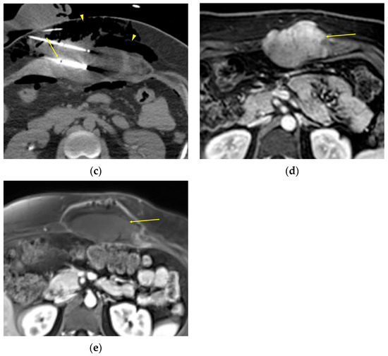 A 36-year-old woman with an abdominal wall desmoid tumor. Pretreatment T2 images (a) were predominantly hypointense suggesting low cellularity. The patient underwent cryoablation therapy shown in axial CT (c) with ablation probe (arrow) and subcutaneous gas (arrowheads). Posttreatment T2 (b) shows heterogeneous increased internal T2 signal (arrow), which could be mistaken for increased cellularity. However, comparison of the preablation (d) and postablation (e) postcontrast T1 images show marked reduction in enhancement with increased internal fluid levels (arrow), compatible with post-ablation necrosis.