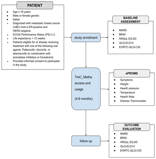 The TreC_Metha project is founded on an innovative approach that integrates these objectives into a cohesive system. It is hypothesized that the application will benefit patients, healthcare providers, and organizations alike, as well as ensure a more effective and patient-centered treatment pathway, as reported in Table 1. In this paper, we present the analysis phase of the mBC care process, along with the objectives and functionalities that a technological tool like the TreC_Metha platform must have to effectively support the HR+HER2 negative mBC care pathway. In the next steps, a fully functional prototype that provides a realistic representation of its visual structure and functionality will be tested on a limited number of patients. Only after this step, a pilot study will evaluate the acceptability, usability, and impact of TreC_Metha on QoL of 50 HR+HER2-negative patients. The sustainability and the expected outcomes of the project approach will be assessed through a dedicated analysis that will consider the following: