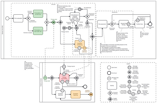 BPMN Diagram of the metastatic breast cancer pathway (see legend explanation in Section 3.2). The colored boxes show where the TREC_platform is applied.