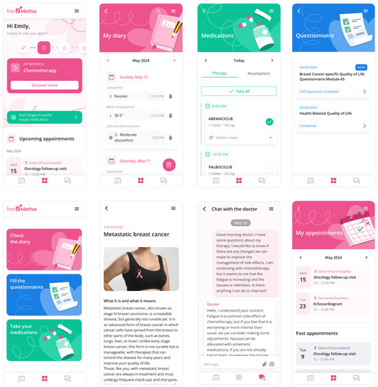 A detailed analysis of the phases, activities, and actors involved in the mBC care path was conducted to identify differences from early BC and represented using formal process notation BPMN (Business Process Modeling and Notation (Object Management Group, Business Process Model And Notation (BPMN) https://www.omg.org/spec/BPMN/2.0; accessed on 1 December 2010)), an OMG (Object Management Group) standard that combines a graphical notation for the formal and unambiguous representation of procedures with the ability to communicate in a way that is understandable to individuals who are not familiar with formal languages. This analysis helped determine at which stages the TreC_Metha platform can support patients and healthcare professionals. The Trec_Metha app for the patients has been designed in strict collaboration with the final users through participatory design sessions involving the various stakeholders through interviews or focus groups. In the initial phase of participatory design, the distribution of a questionnaire was conducted through the web (CAWI) to a cohort of patients (N = 20) with the aim of assessing the level of awareness concerning their pathway, determining the extent to which their information needs were met, and identifying the necessary measures to address the prevailing information deficit. Following survey analysis, two focus groups were conducted on two separate occasions, with a total of 11 patients (of differing ages, social backgrounds, and educational qualifications). The facilitation of these groups was overseen by a facilitator with extensive experience in the field of user experience.